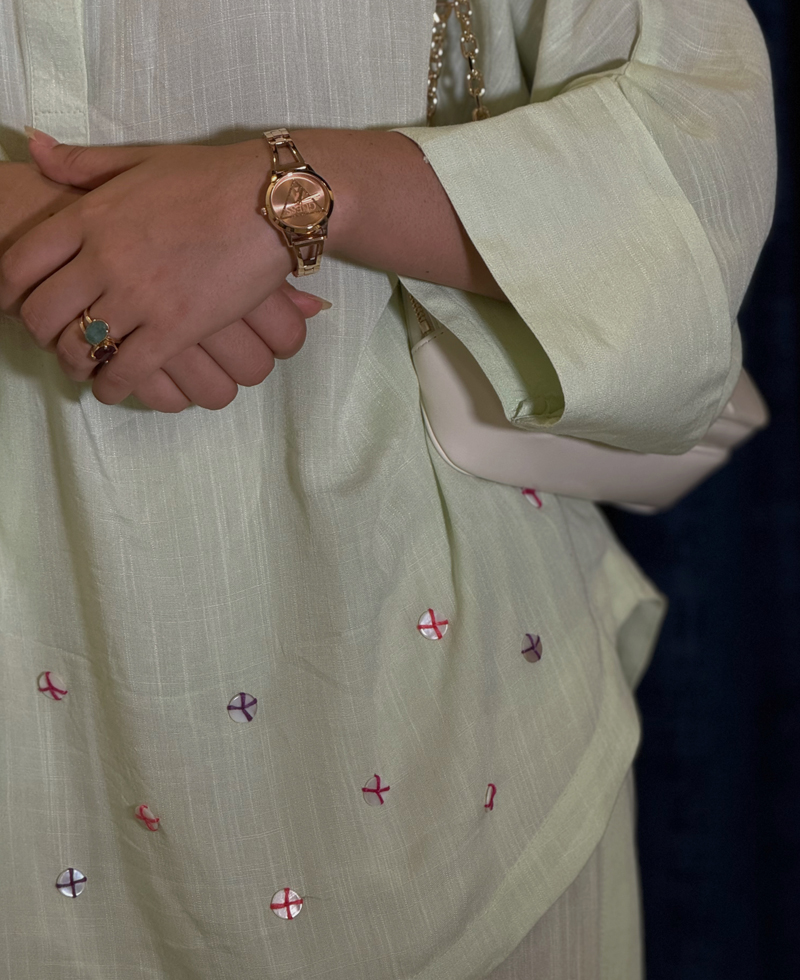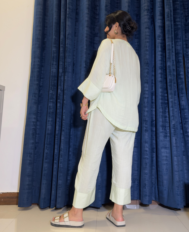 A co-ord set of every girl’s dreams, has a beautiful silhouette with a soft pure Irish cotton that falls on the body perfectly, it’s flowy and gives a flattering fit!